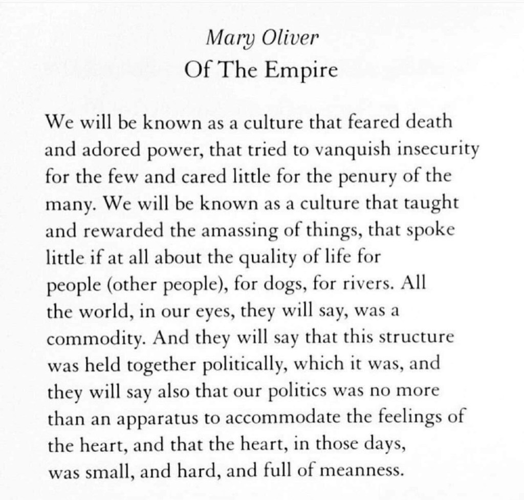 Mary Oliver wrote a fit epitaph for this pitiable society, held in thrall to the broligarchs and the chaplains of empire. It was published in her collection Devotions in 2008. We can hope that a better society may yet follow this one.