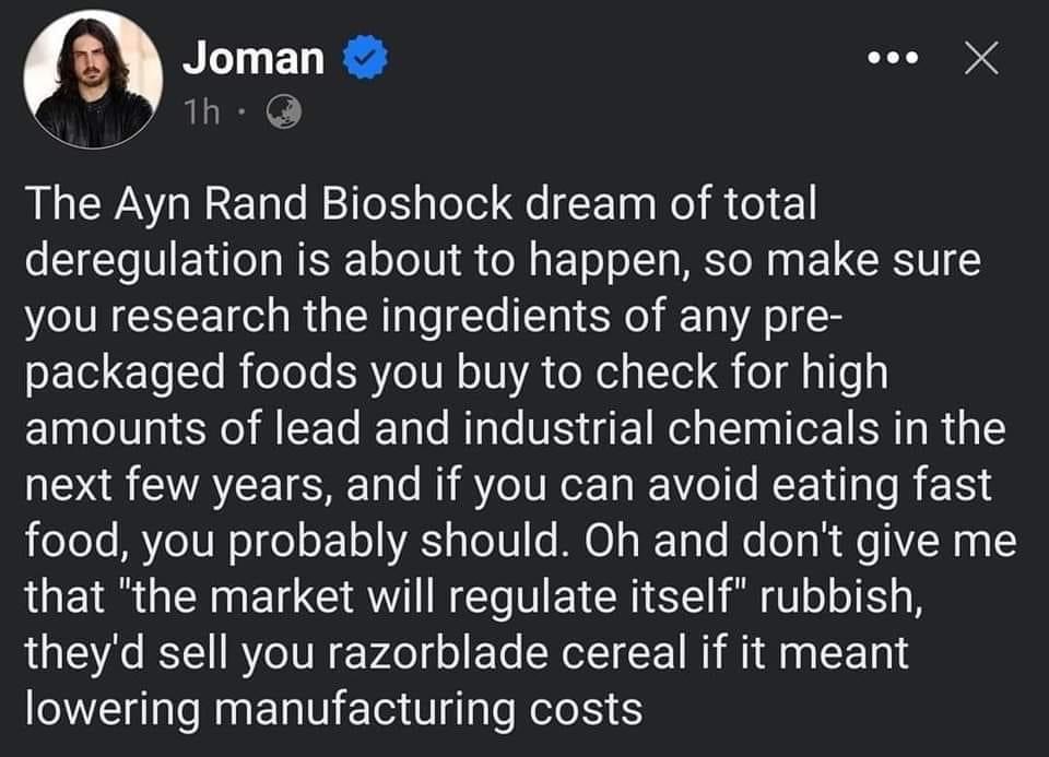 But now, they’re going to attack the very idea of a social contract that does much more than drop bombs and protect wealth, most especially the wealth of the most prosperous cisgender, heterosexual white Christians. I saw someone online aptly call this the “Ayn Rand Bioshock dream of total deregulation”.